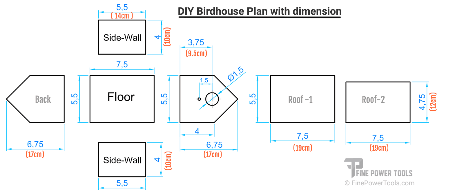 Here is a sample birdhouse plan with detail dimensions. The fig-1 shows the front-view and side-view of the finished birdhouse.